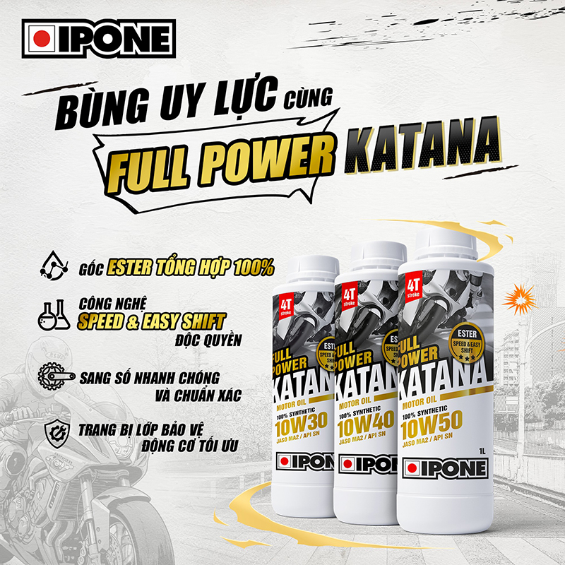 Ipone Full Power Katana 10W40 là dòng dầu nhớt tổng hợp bán phần (Semi-Synthetic) cao cấp đến từ thương hiệu Ipone – Pháp. Sản phẩm được thiết kế để bôi trơn toàn diện, bảo vệ động cơ và tăng tuổi thọ xe máy, phù hợp với hầu hết dòng xe số, tay ga và côn tay tại Việt Nam.